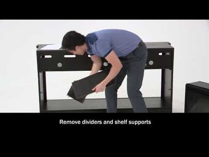 Make watching TV a joy. This TV stand's rustic-industrial style—with a gray finish, squared edges, zinc-tone corner bracket accents and nailhead detailing—is sure to complement any contemporary decor. Several vented open cubbies offer impressive shelf space, convenient for keeping all of your electronic gear within reach. Handy cutouts keep cords out of sight. The stand's large center opening accommodates a shelving insert (included) or an optional fireplace insert (sold separately).